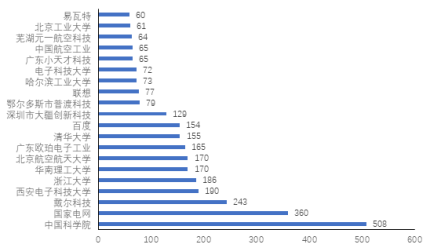 注:排名前20名的高校、科研院校有:北京工業(yè)大學(xué)、電子科技大學(xué)、哈爾濱工業(yè)大學(xué)、清華大學(xué)、北京航天航空大學(xué)、華南理工大學(xué)、浙江大學(xué)、西安電子科技大學(xué)及中國(guó)科學(xué)院,其余均為企業(yè)。
