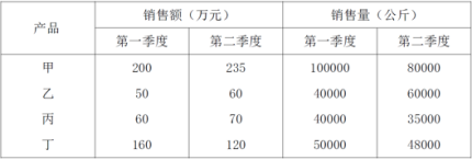 某水產(chǎn)公司共銷售甲、乙、丙、丁四種魚類產(chǎn)品。其在兩個(gè)季度的銷售額和銷售量情況如下: