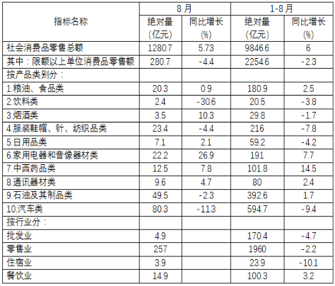 2019年1-8月,遼寧省社會消費(fèi)品零售總額9846.6億元,比上年同期增長6.0%,增速回落1.6個(gè)百分點(diǎn)。限額以上單位消費(fèi)品零售額實(shí)現(xiàn)2254.6億元,同比下降,增速回落6.5個(gè)百分點(diǎn)。