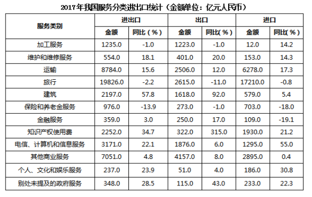 C.2017年我國(guó)服務(wù)進(jìn)出口中,其他商業(yè)服務(wù)進(jìn)出口實(shí)現(xiàn)的順差最多