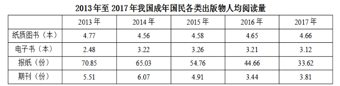 A.2013年至2017年我國(guó)成年國(guó)民人均電子書(shū)閱讀量逐年上升