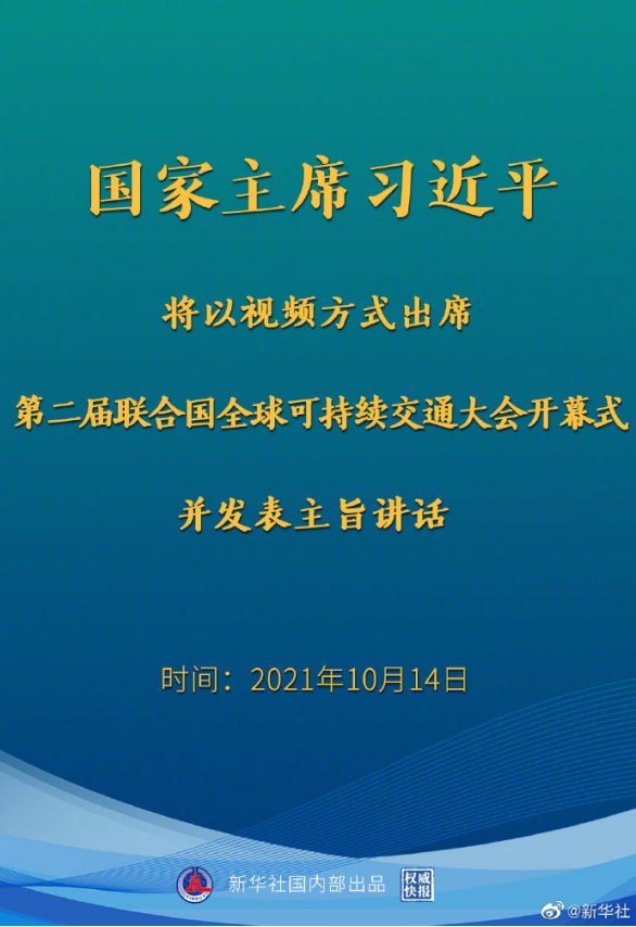 新華社北京10月13日電 外交部發(fā)言人華春瑩13日宣布:國家主席習(xí)近平將于10月14日以視頻方式出席第二屆聯(lián)合國全球可持續(xù)交通大會開幕式并發(fā)表主旨講話。