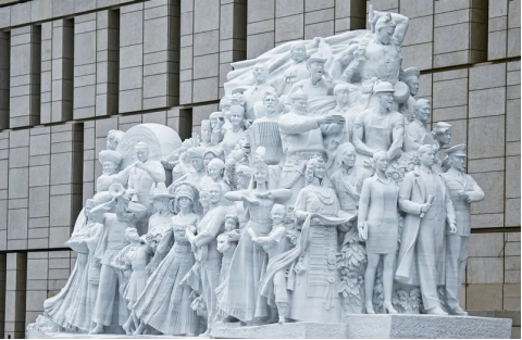 中國共產(chǎn)黨歷史展覽館西側(cè)廣場(chǎng)上矗立的《信仰》、《偉業(yè)》、《攻堅(jiān)》、《追夢(mèng)》四組大型雕塑,分別對(duì)應(yīng)“四個(gè)偉大”主題。在雕塑《追夢(mèng)》中,73位人物形象融入主體之中,形成團(tuán)結(jié)一致、闊步前行的恢宏陣勢(shì),重點(diǎn)表現(xiàn)全國各族人民在中國共產(chǎn)黨的團(tuán)結(jié)帶領(lǐng)下,為了實(shí)現(xiàn)民族復(fù)興,在百年接續(xù)奮斗中走中國道路、弘揚(yáng)中國精神、凝聚中國力量,堅(jiān)毅前行的豪邁氣概。 劉新武/攝
