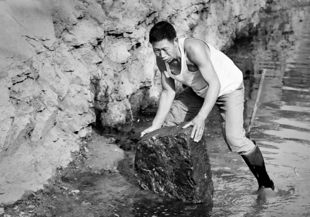 張買江在清理紅旗渠內(nèi)的落石(1991年7月攝)。 新華社記者 王頌/攝