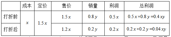 【答案】C【解析】通過題目可知這批童裝在銷售時分為打折前和打折后兩個階段,所以不妨在表格中將這兩個階段表示出來,接著題目說“按每套獲利50%定價賣出這批童裝的80%”,此時給出打折前的利潤率為50%,需注意:利潤率=售價/成本-1;此時如果設(shè)成本為y,則剛開始的定價應(yīng)為1.5x;同時已知打折前賣出80%,其實也就是總銷量的80%,但總銷量未知,所以如果設(shè)總銷量為x,則打折前售出0.8y,之后“定價的八折將剩下的童裝全部賣出”,即打折后的售價應(yīng)為:1.5x×0.8=1.2x,同時打折后的銷量為1-0.8y=0.2y,最后題目給出等量關(guān)系“總利潤比預(yù)期減少了390元”,其實就是:按原定價銷售完的總利潤-(打折前的總利潤+打折后的利潤)=390元。之前已表示出兩個階段的成本、售價、銷量;所以兩個階段分別的總利潤=單套利潤×銷量;而單套利潤=售價-成本,把出現(xiàn)的基本概念全部表示在表格中,再根據(jù)等量關(guān)系就有: