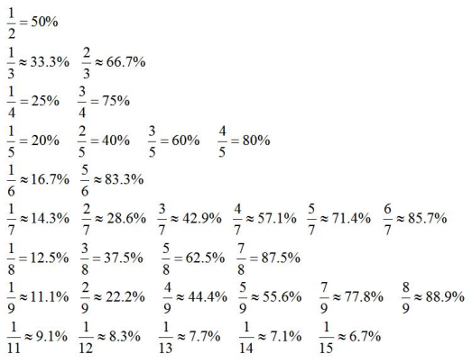這樣看起來,是不是就非常的簡單。而這種將百分數(shù)近似的看做分數(shù)的方法,就是我們講的特征數(shù)字法。關(guān)于這個方法,如果想要運用的好,就必須要知道常見的百分數(shù)和分數(shù)的轉(zhuǎn)化關(guān)系,下面我們就給大家系統(tǒng)的梳理下: