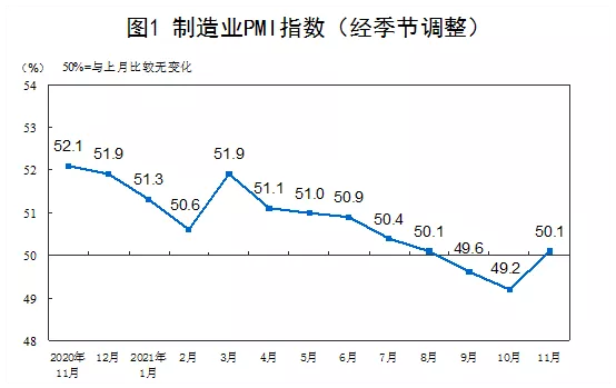 11月份,制造業(yè)采購經(jīng)理指數(shù)為50.1%,比10月上升0.9個百分點(diǎn)。