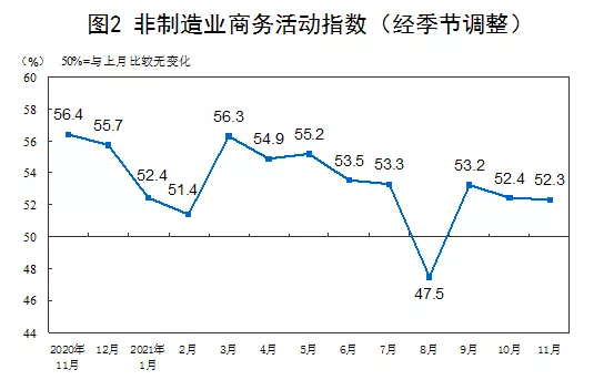 11月份,非制造業(yè)商務(wù)活動指數(shù)為52.3%,比10月略降0.1個百分點(diǎn),繼續(xù)高于臨界點(diǎn),非制造業(yè)總體保持穩(wěn)定恢復(fù)。