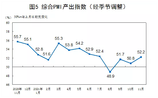 11月份,綜合PMI產(chǎn)出指數(shù)為52.2%,比10月上升1.4個百分點(diǎn),表明我國企業(yè)生產(chǎn)經(jīng)營活動總體擴(kuò)張步伐有所加快。