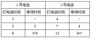 【例題2】公用電話亭中有兩部電話,六個(gè)人排隊(duì)打電話,打完即走,他們的通話時(shí)間分別為3分鐘、5分鐘、4分鐘、13分鐘、7分鐘、8分鐘,則大家在此公用電話亭逗留的總時(shí)間最少為( )分鐘。