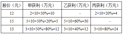 【例題1】甲、乙、丙三人各出100萬(wàn)元資金購(gòu)買(mǎi)某種每股10元的股票,當(dāng)股價(jià)漲到12元時(shí)甲賣(mài)出50%,丙賣(mài)出20%;當(dāng)股價(jià)漲到15元時(shí)甲賣(mài)出剩余部分的20%,乙賣(mài)出60%;此后股價(jià)回落到13元時(shí)三人全部賣(mài)出剩余股票。如不計(jì)稅費(fèi),則此次投資獲利最高的人比獲利最低的人多賺多少萬(wàn)元?( )