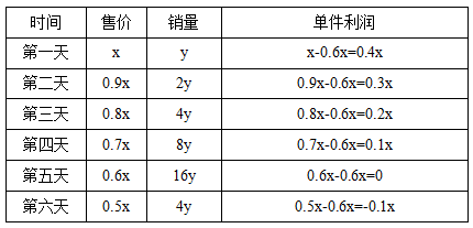 對(duì)于本題,想要求總利潤(rùn)與總成本之間的關(guān)系,就得理清楚這六天的利潤(rùn)和成本的情況,由于涉及的天數(shù)較多,為避免混亂,表格法整理必是首選。另外,需要注意的是,審題要仔細(xì),售價(jià)是每天都下降原價(jià)的10%,而銷(xiāo)量是比上一天多1倍。