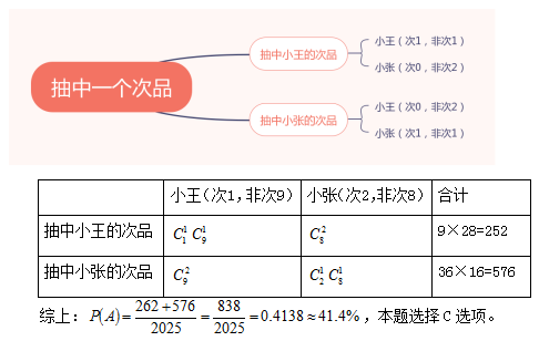 【例題】小王和小張各加工了10個(gè)零件,分別有1個(gè)和2個(gè)次品。若從兩人加工的零件里各隨機(jī)選取2個(gè),則選出的4個(gè)零件中正好有1個(gè)次品的概率為:( )