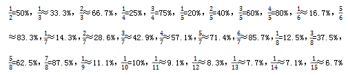這種方法的本質(zhì)是將百分?jǐn)?shù)轉(zhuǎn)化為分?jǐn)?shù)去進(jìn)行計算,但如果我們對一些常見的百分?jǐn)?shù)不夠熟悉,就無法將它轉(zhuǎn)化為分?jǐn)?shù),所以這里也給各位補(bǔ)充一些常見的百分?jǐn)?shù)與分?jǐn)?shù)間的轉(zhuǎn)化: