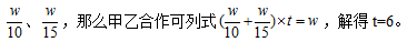 方法二:已知甲、乙?guī)煾祮为?dú)施工分別需要10天和15天,可設(shè)工作總量w為他們時(shí)間的最小公倍數(shù)為30,則甲、乙的工作效率分別為3和2,那么他們合作完工需要30÷(3+2)=6天。