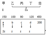 后期追加投資額為200萬元,假設(shè)四車間所得投資額分別為a、b、c、d萬元,且每個(gè)車間的追加投資額都小于等于其余任一車間追加投資額的2倍,以a為例:a≤2b,a≤2c,a≤2d。要想總投資額最大的車間和總投資額最小的車間相差最多,則需要讓最開始得到投資額最多的車間得到追加的投資額最多,最開始得到投資額最少的車間得到追加投資額最少即可,丙車間原本最少,假設(shè)它追加投資額為z(即四車間最少得到追加投資額為z),甲車間原本最多,其追加投資額最多為2z。