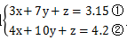 【例題1】甲、乙、丙三種貨物,如果購(gòu)買甲3件、乙7件、丙1件需花3.15元;如果購(gòu)買甲4件、乙10件、丙1件需花4.2元,那么購(gòu)買甲、乙、丙各一件需要花多少元錢?( )