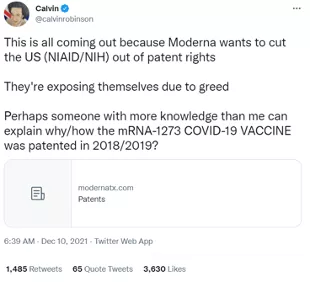 配文中,羅賓遜聲稱美國(guó)國(guó)立衛(wèi)生研究院(NIH)在疫情暴發(fā)之前就與莫德納公司(Moderna,Inc.)簽署了關(guān)于“冠狀病毒疫苗”研發(fā)的秘密協(xié)議,并且mRNA-1273新冠疫苗在2018/19年就已經(jīng)獲得專利立項(xiàng)。與此同時(shí),羅賓遜還附上了莫德納公司專利證明頁(yè)面,作為上述論斷的依據(jù)。
