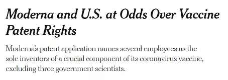 今年11月,《紐約時(shí)報(bào)》刊文《莫德納和美國(guó)在疫苗專利權(quán)問題上發(fā)生分歧》(Moderna and U.S. at Odds Over Vaccine Patent Rights),披露了莫德納和美國(guó)官方的專利權(quán)之爭(zhēng)。