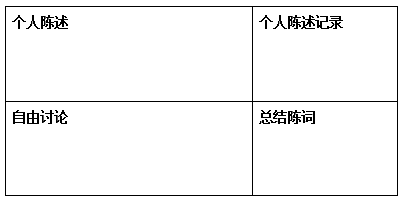 當(dāng)然,考慮到記錄內(nèi)容的多寡,可以調(diào)整四個片區(qū)的大小,比如個人陳述提綱和自由討論內(nèi)容較多,可以選擇將左邊上下兩個區(qū)域面積擴(kuò)大。