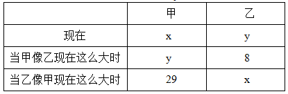 例3:甲乙兩人年齡不等,已知當(dāng)甲像乙現(xiàn)在這么大時(shí),乙8歲;當(dāng)乙像甲現(xiàn)在這么大時(shí),甲29歲。問(wèn)今年甲的年齡為多少歲( )?