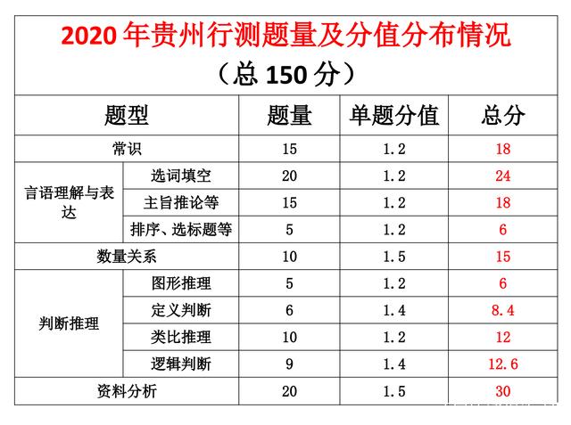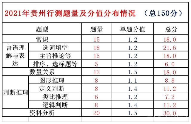 貴州省考行測(cè)分值總和為150分,言語理解與判斷推理兩塊占比最大。2021年貴州省考數(shù)量關(guān)系較2020年增加了2道。