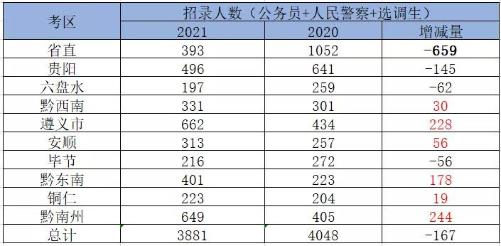 去年招錄人數(shù)增長(zhǎng)最多的前三個(gè)地市分別為黔南州、遵義市、黔東南。招錄人數(shù)縮減最多的是省直,縮減了659人。