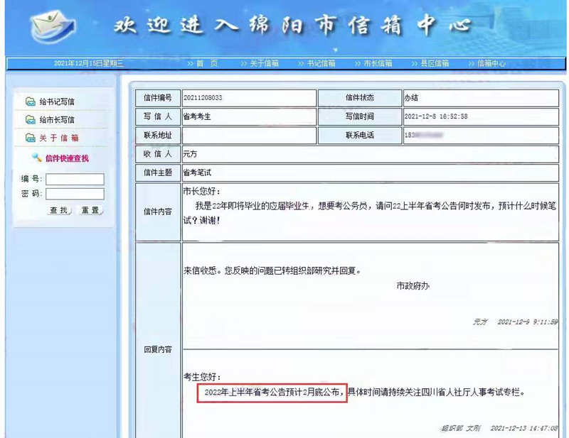另外,有考生在綿陽(yáng)市長(zhǎng)信箱咨詢2022上半年四川省考時(shí)間,官方回復(fù):2022上半年四川省考公告預(yù)計(jì)2月底公布?!?/p>