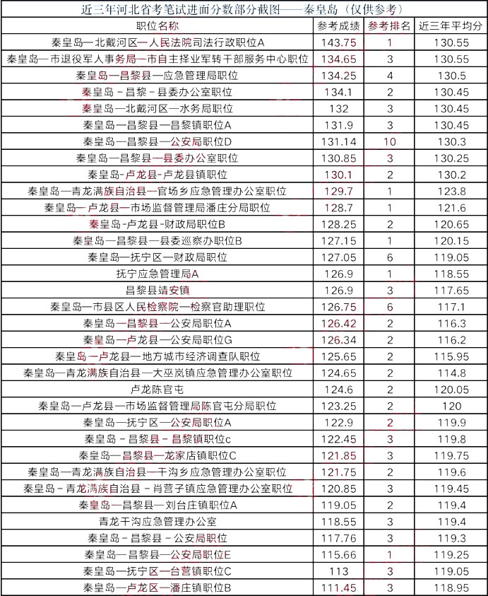 由于2018 年機構(gòu)改革,河北省公務(wù)員招錄情況特殊,只招錄鄉(xiāng)鎮(zhèn)崗位。秦皇島地區(qū)招錄鄉(xiāng)鎮(zhèn)公務(wù)員69人,報名繳費4977人。公考大神云集鄉(xiāng)鎮(zhèn)崗,故2018鄉(xiāng)鎮(zhèn)崗位分?jǐn)?shù)偏高, 秦皇島鄉(xiāng)鎮(zhèn)公務(wù)員平均進面分?jǐn)?shù)130。