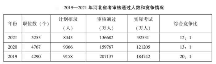 ?。?019-2021年河北省考審核通過人數(shù)和競爭情況)
