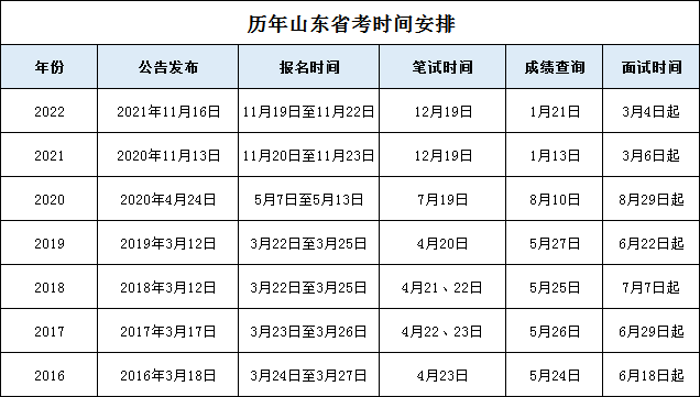 根據(jù)上表,我們可以發(fā)現(xiàn):2016~2019年山東公務員考試時間較穩(wěn)定,2020年山東省考受疫情影響有所推遲,而2021~2022年山東省考較往年提前4個月!