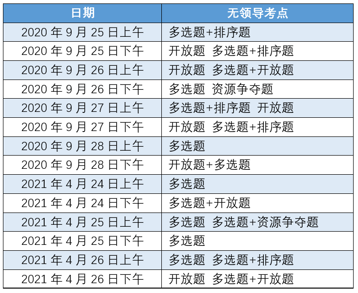 根據(jù)2020年和2021年考察的題目來看,考察比較多的題型是多選題、開放題。資源爭奪題考察的頻率不高,單獨考察只出現(xiàn)過一次。排序題常常作為復(fù)合題型的考察點出現(xiàn)在題目中。