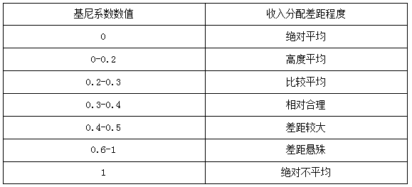 基尼系數(shù)是指國際上通用的、用以衡量一個國家或地區(qū)居民收入差距程度的常用指標(biāo)?;嵯禂?shù)是一個介于0-1之間的小數(shù),基尼系數(shù)越大,表示不平等程度越高?;嵯禂?shù)在不同區(qū)間,代表著不同的收入分配差距程度,下面,我們通過一個表格進行了解。