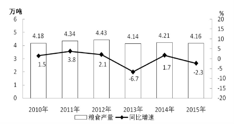 2010—2015年某市糧食產(chǎn)量及其增速
