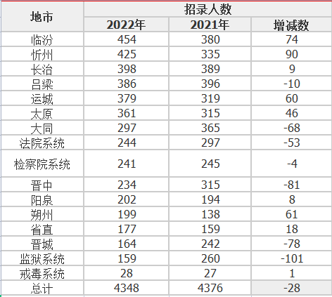 從2022山西省考招錄來看,臨汾市招錄人數(shù)最多,達(dá)到454人,超越去年的呂梁市穩(wěn)居榜首,招錄人數(shù)最少的依舊是戒毒系統(tǒng),僅招錄28人;從增減量來看,忻州、運(yùn)城、朔州等地市逆勢(shì)上漲,監(jiān)獄系統(tǒng)降幅最大,比去年減少了一百多人,有地域選擇的考生可以參考上述數(shù)據(jù)。