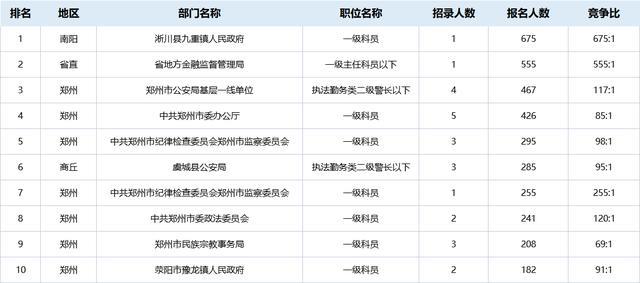 另外,根據(jù)首日?qǐng)?bào)名情況,報(bào)名人數(shù)較多的十大崗位也已出爐。大部分為省直和鄭州地區(qū)崗位: