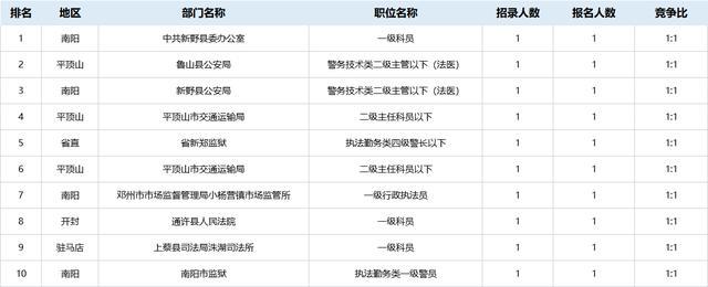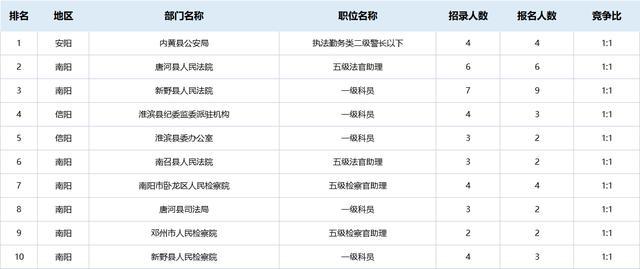 值得關(guān)注的是,目前競(jìng)爭(zhēng)較低的十大崗位多分布于南陽(如下圖所示),多是一些檢察院和法院,因?yàn)閳?bào)考法院和檢察院系統(tǒng)部分崗位需要取得《法律職業(yè)資格證書》A證,條件的限制,也讓很多考生“拒之門外”。