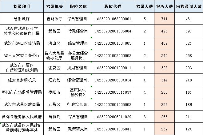 截至2月23日,2022年湖北公務(wù)員考試報名第五天,已有111441人報名,76329人通過審核,報名人數(shù)最多的職位是(省財政廳-綜合管理崗1-14230201068000001)一職,該崗位招錄5人,已有711人報名,481人通過審核。截至2月23日,共有170個崗位無人報考。具體可下載附件查看:
