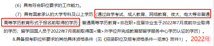 具有國家承認的大學??萍耙陨蠈W歷(通過自學考試、成人教育、網(wǎng)絡(luò)教育、夜大、電大等非普通高等學歷教育形式于報名前取得的學歷;普通高等學歷教育<非在職>應(yīng)屆畢業(yè)生于2022年7月底前畢業(yè)取得的學歷;留學回國人員于2022年7月底前取得國<境>外學位并完成教育部留學服務(wù)中心學歷認證的學歷)。