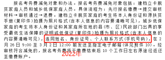 在2022年的公告中,對于減免考務(wù)費的考生來說,提交審核材料到電子郵箱時,除了需要把相關(guān)證件拍攝成照片,還需要在郵件正文寫上姓名、身份證號、個人聯(lián)系方式這3項信息。