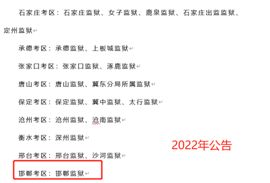 在2022年的公告中,司法廳系統(tǒng)考區(qū)變化,從過去的8個變成了9個,新增邯鄲考區(qū)(邯鄲監(jiān)獄)。