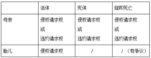 觀察此表格可知,針對胎兒的侵權(quán)依舊依照胎兒是否存活分為三種情況:1.胎兒分娩后為活體。此時母親可以以自己的名義提起侵權(quán)或違約之訴,同時胎兒也有自己獨立的訴求,可以向醫(yī)院主張侵權(quán),只不過該權(quán)利應(yīng)該由監(jiān)護(hù)人代為行使。2.胎兒分娩后為死體。該種情況胎兒無獨立的請求權(quán),僅母親以自己的名義主張侵權(quán)或違約。3.胎兒分娩出時為活體,很快死亡。此類情況在實踐中仍舊存在爭議,對于胎兒死亡后,留下的債權(quán)請求權(quán)是否可以被母親繼承現(xiàn)在法律仍沒有給出明確的答案,此問題不在考察的范圍內(nèi)。