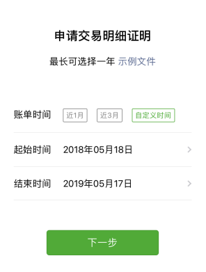第六步:選擇調(diào)取用途后,可進(jìn)一步選擇具體日期區(qū)間,支持調(diào)取自定義時(shí)間內(nèi)的交易流水,最長(zhǎng)不超過(guò)一年。