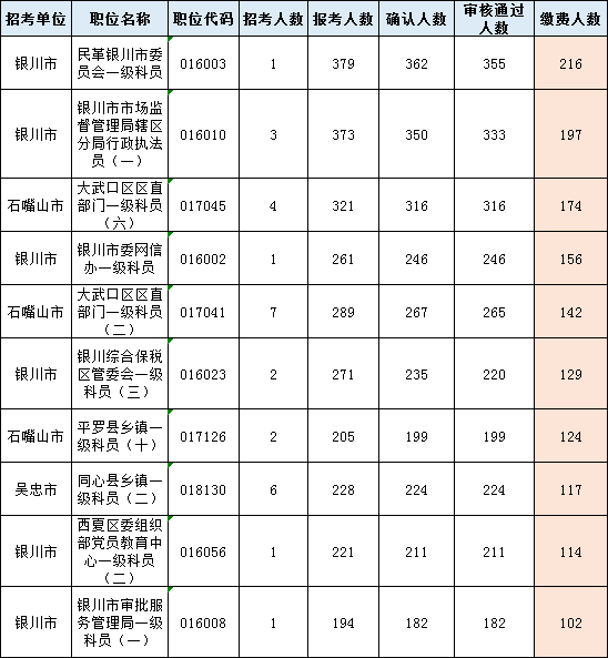 以下為繳費(fèi)人數(shù)最多的前十崗位
