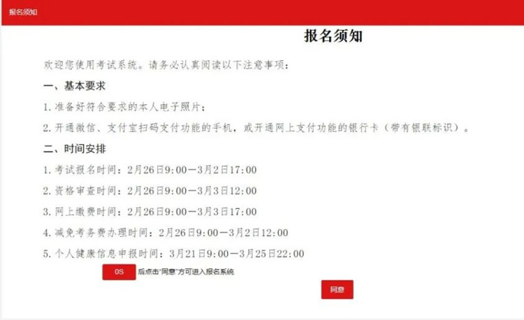 登錄后考生會看到本次考試的報名須知,仔細(xì)閱讀須知信息,點擊同意進(jìn)入到報考界面。
