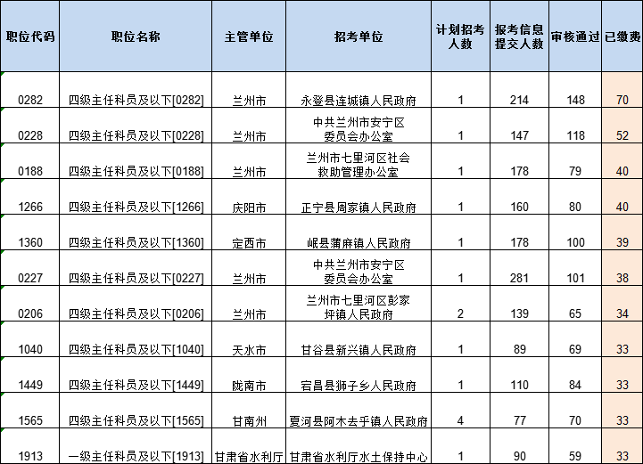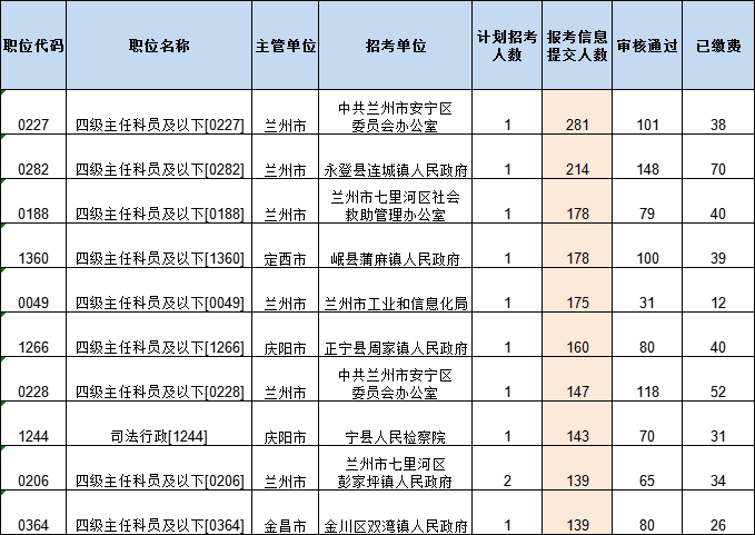 截止2月27日17時,2022年甘肅公務(wù)員考試共有14550人提交報名,7253人通過審核,3494人繳費,346個崗位無人報考,具體數(shù)據(jù)詳見附件: