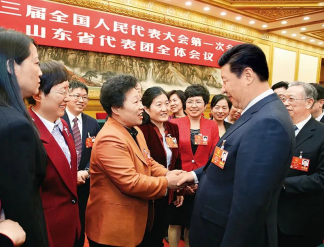 2018年3月8日,中共中央總書記、國家主席、中央軍委主席習(xí)近平參加十三屆全國人大一次會議山東代表團(tuán)的審議。在“三八”國際勞動婦女節(jié)到來之際,習(xí)近平代表黨中央,向參加全國兩會的女代表、女委員、女工作人員,向全國各族各界婦女同胞,致以節(jié)日的祝賀和誠摯的祝福。這是習(xí)近平同女代表親切交談。新華社記者姚大偉/攝