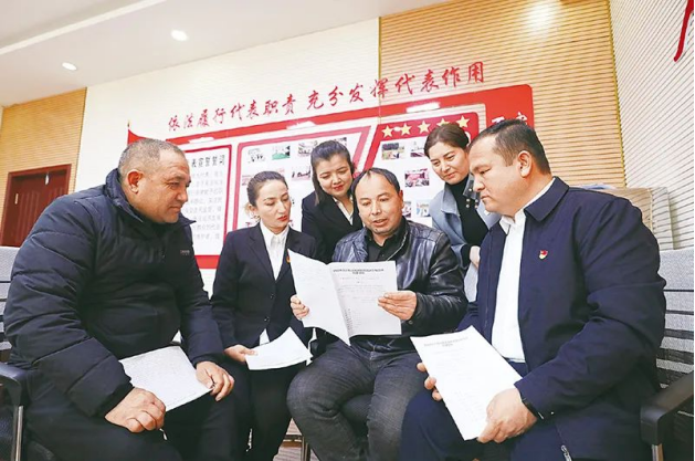 近年來(lái),新疆維吾爾自治區(qū)人大加強(qiáng)地方立法,為新疆社會(huì)穩(wěn)定和長(zhǎng)治久安提供法律保障。圖為2022年2月17日,自治區(qū)人大代表與喀什疏附縣縣鄉(xiāng)兩級(jí)人大代表在疏附縣人大代表工作室共同學(xué)習(xí)《新疆維吾爾自治區(qū)民族團(tuán)結(jié)進(jìn)步模范區(qū)創(chuàng)建條例》。新疆維吾爾自治區(qū)人大常委會(huì)供圖