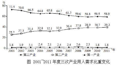 問題:2001-2011年第二產(chǎn)業(yè)與第三產(chǎn)業(yè)用人需求量變化趨勢相反。(判斷正誤)