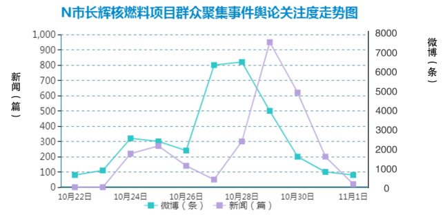 從10月22日至24日短短三天內(nèi),以N市市民為代表的相關(guān)地區(qū)居民進(jìn)行了一系列的線上抗?fàn)幓顒?dòng),尋求與政府的溝通機(jī)會(huì)。線上抗?fàn)幰跃W(wǎng)絡(luò)討論為代表,出現(xiàn)了“N市核危機(jī)”, N市燃料工廠、 “N市反核行動(dòng)”等多個(gè)“熱點(diǎn)話題”,形成強(qiáng)大的輿論合力。市民的抗?fàn)幮袨閺木€上到了線下,連續(xù)三天組織較大規(guī)模的群體上訪。